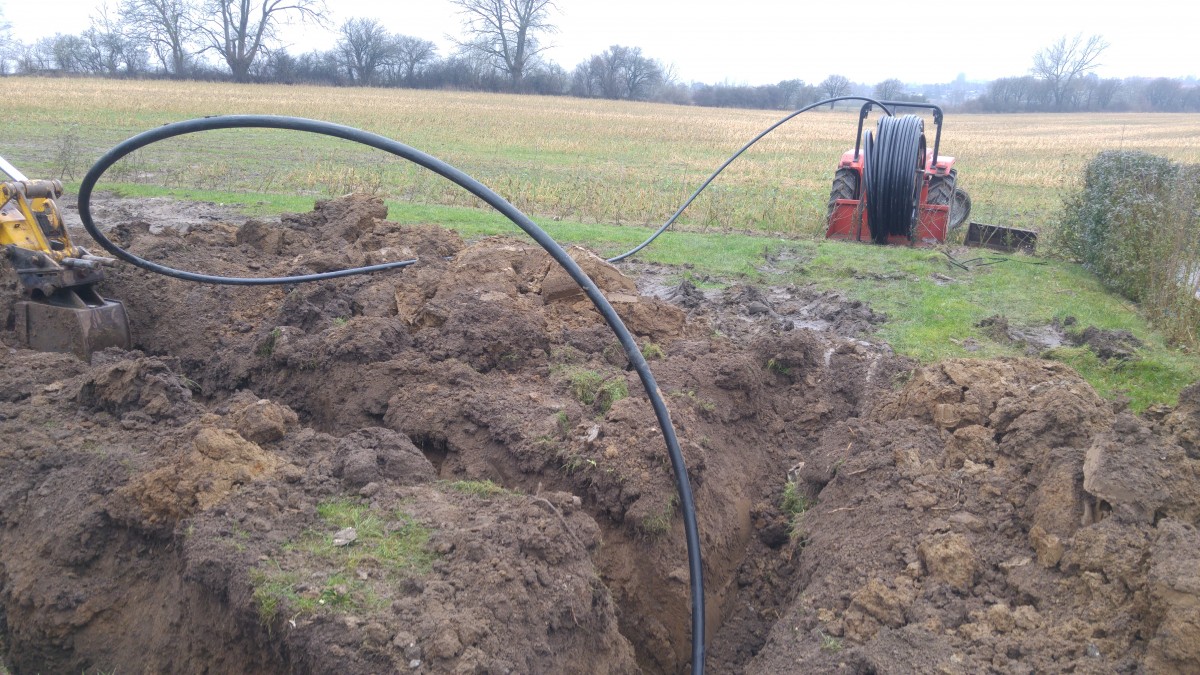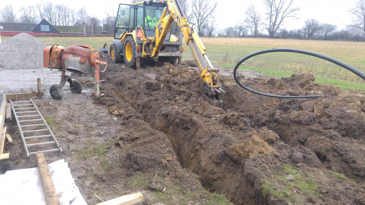 Jordvarme slangerne graves i jorden, lige godt 280-300 meter i bag og forhave kunne der være. Kommer til at blive styret af et Bosch Compress 6000 8 LWM anlæg.