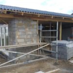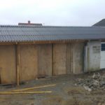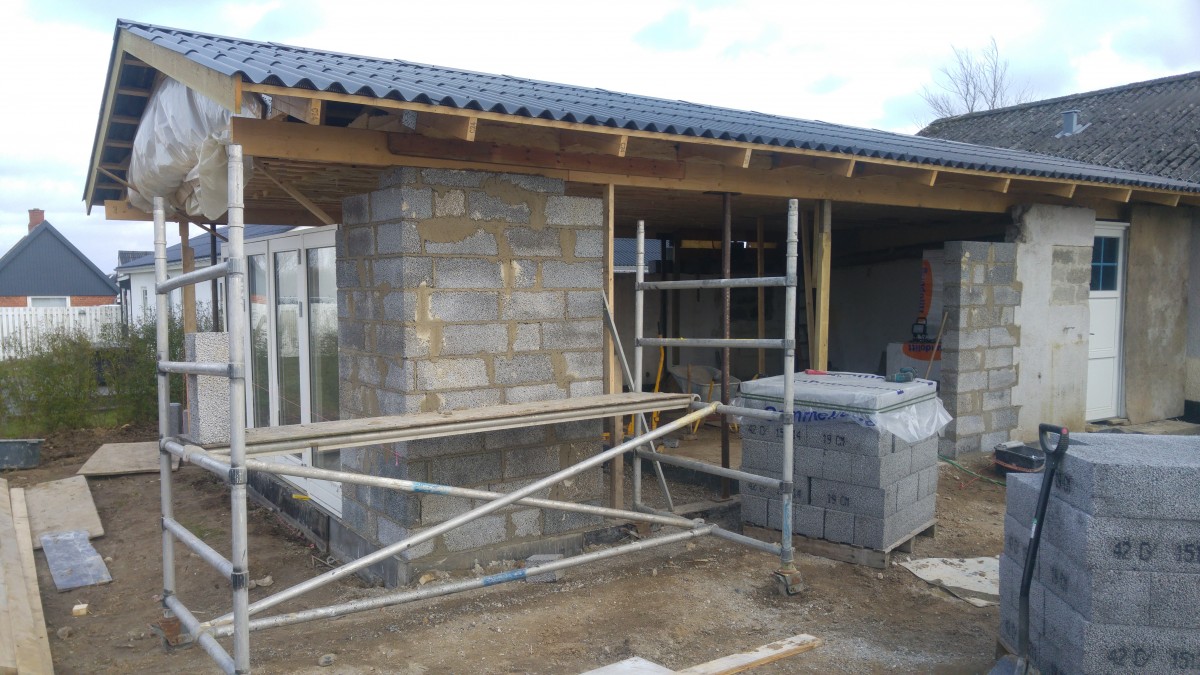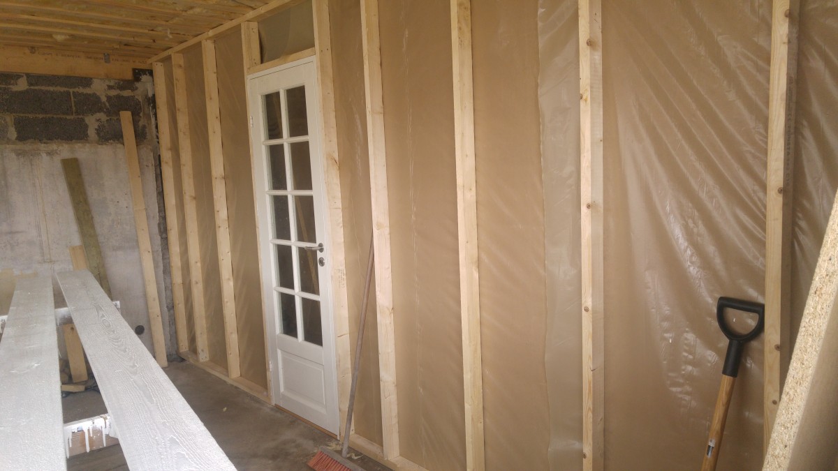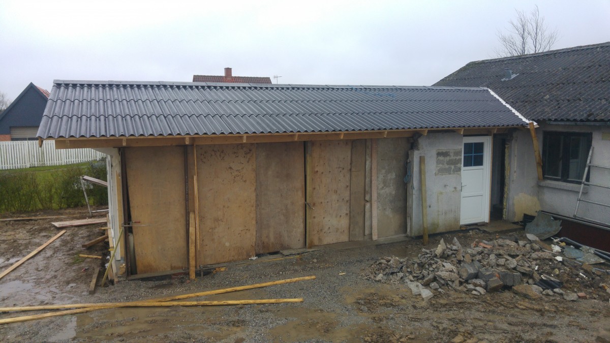 Garagen står ved tag på, og er forholdvis blevet lukket. mangler port og lidt i endegavlen, men det må vente til senere, nu skulle det indvendige få en omgang.
