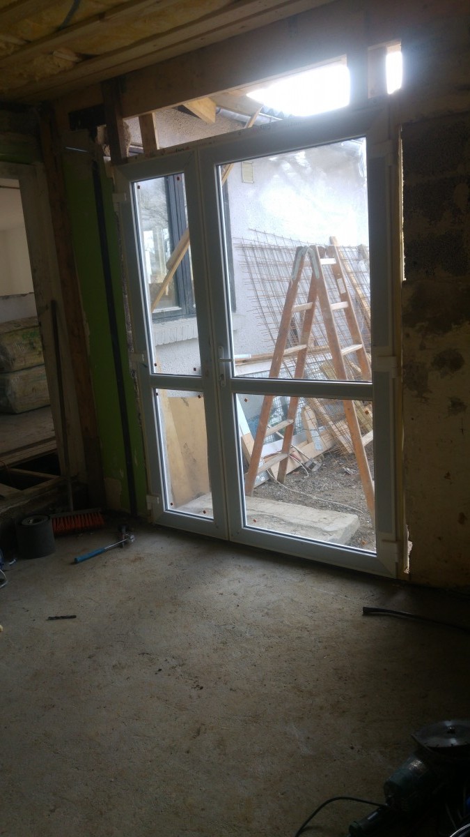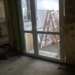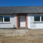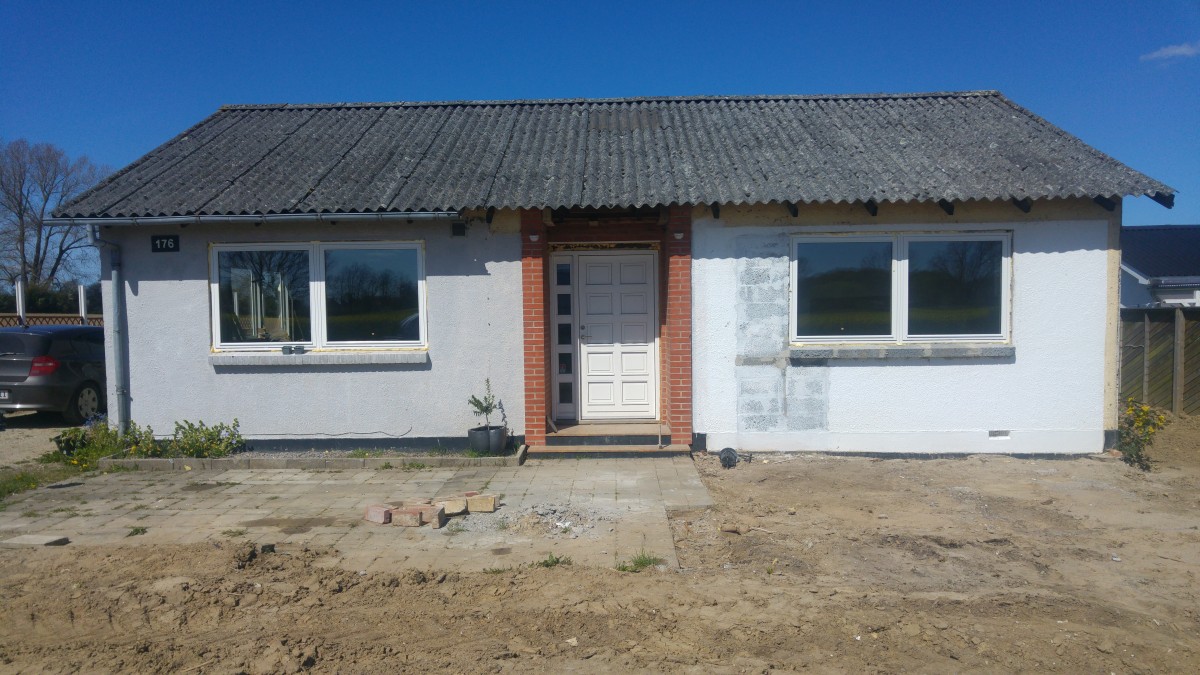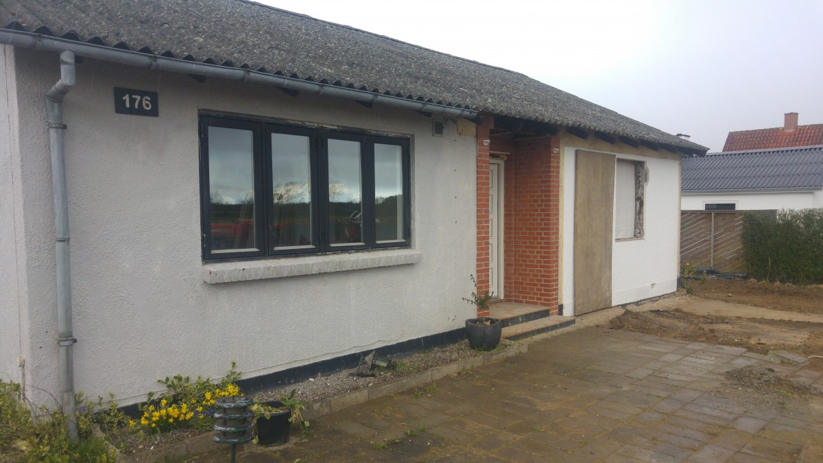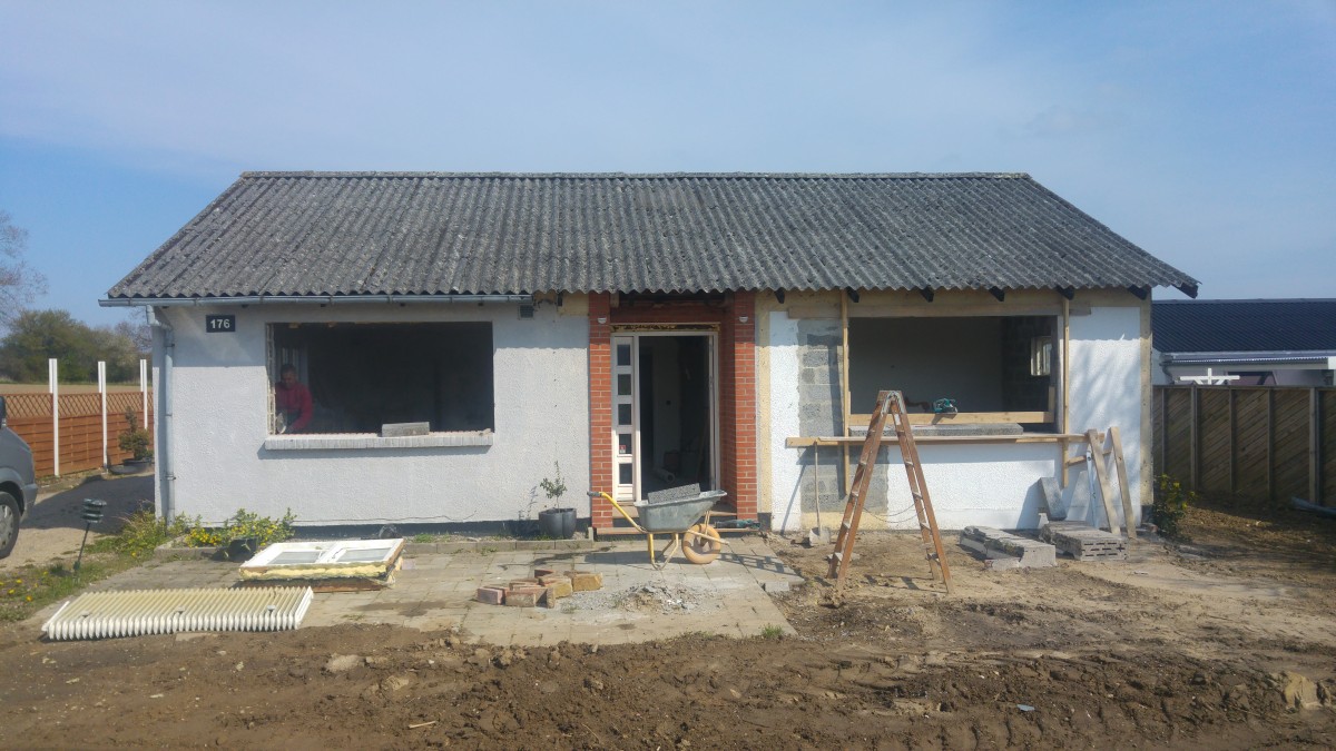 Den gamle rådne udestue er røget ned, og der er i stedet muret og skåret hul til nye vinduer som også er blevet isat.