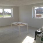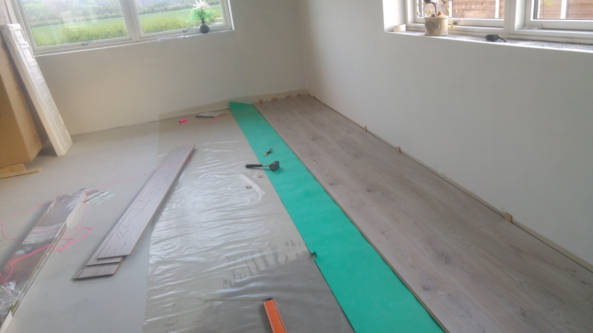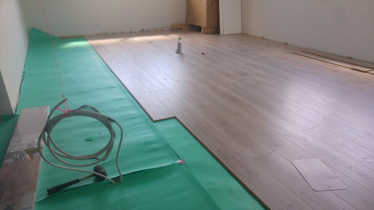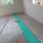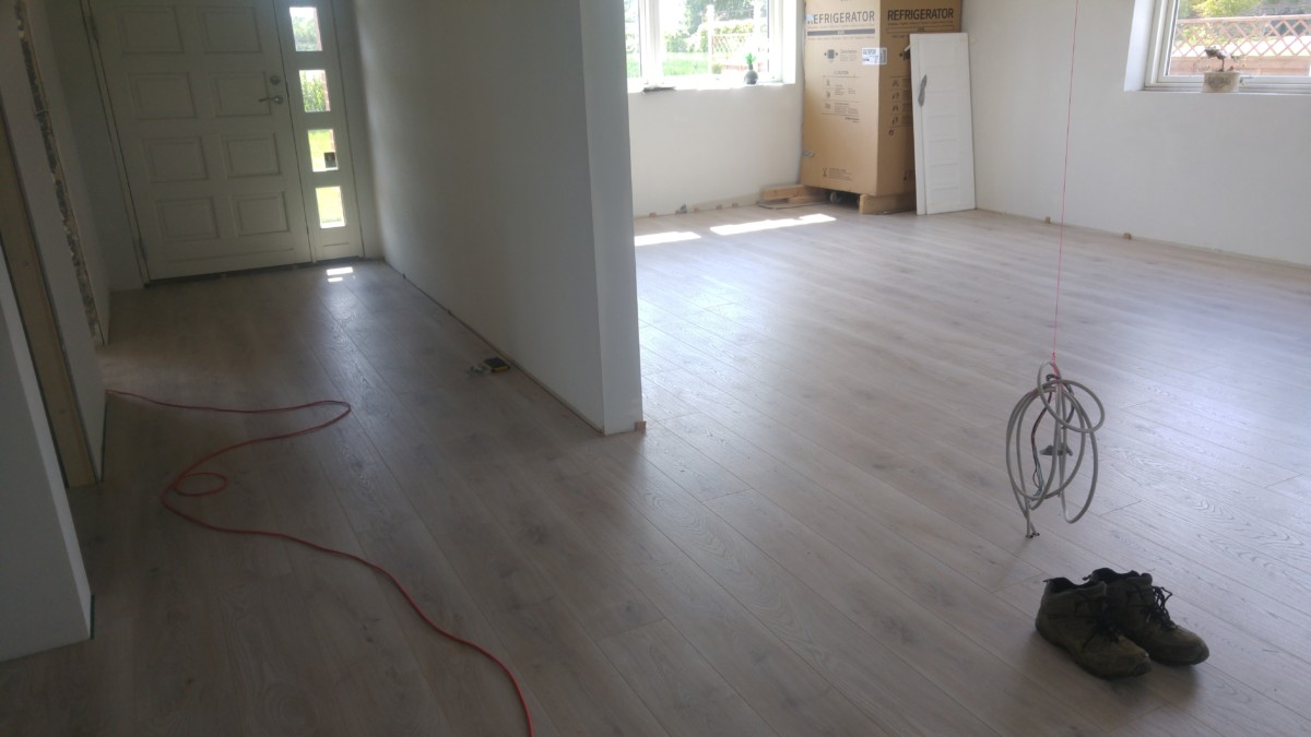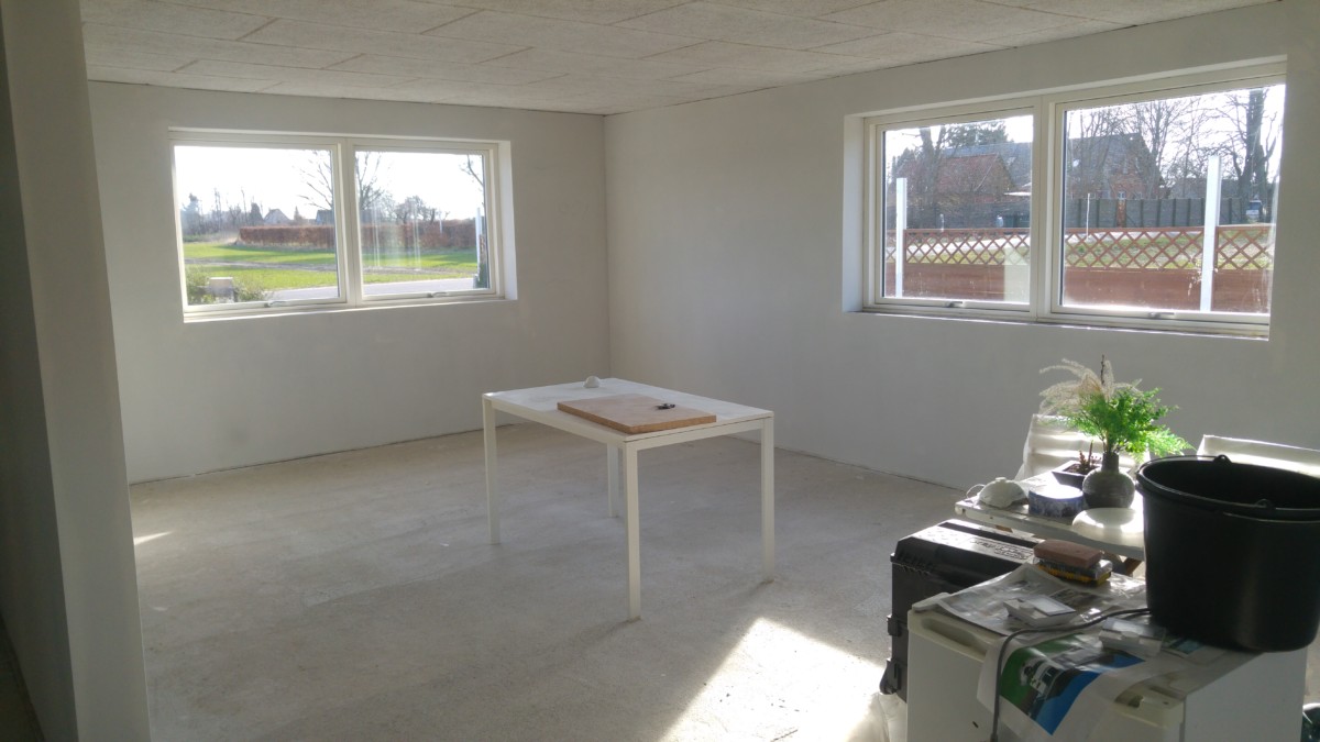 Vægge spartelet, slibet og fået påsat filt, og står nu klar til maling. Gulvet er også blevet spartelt og rettet op, og herefter fået lagt laminat gulv på. Det hjalp en stor del på det kosmetiske look i huset.