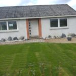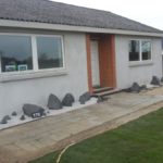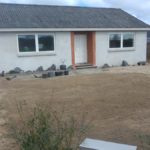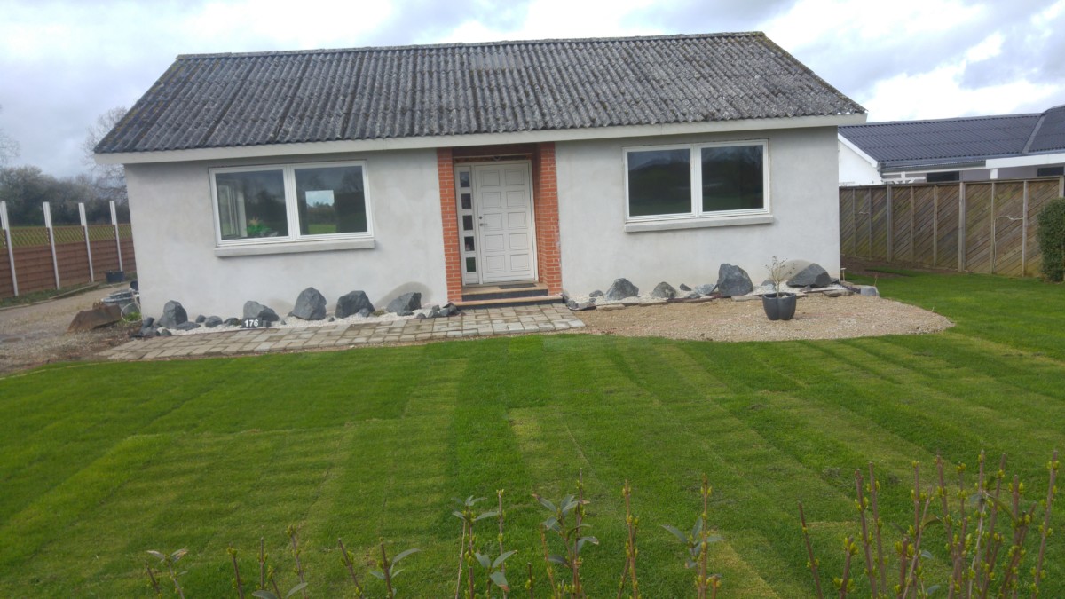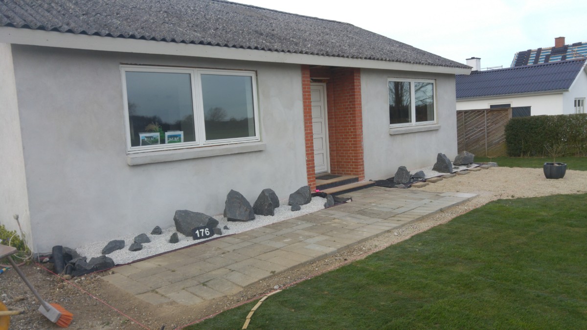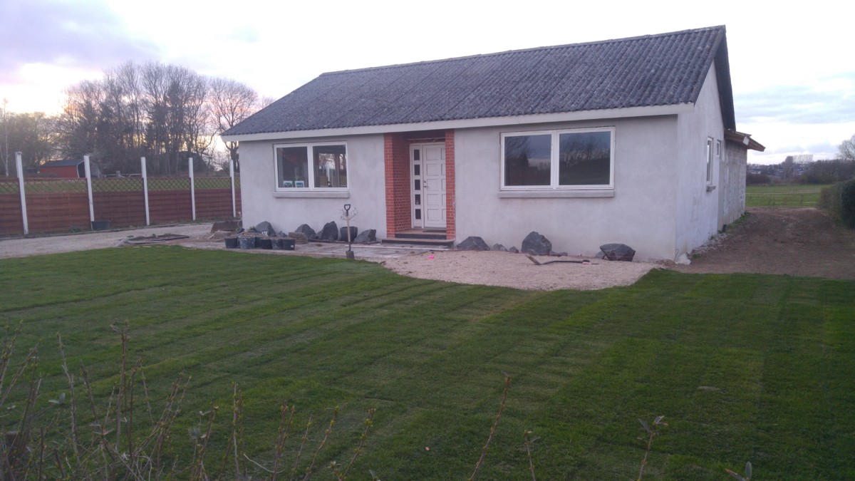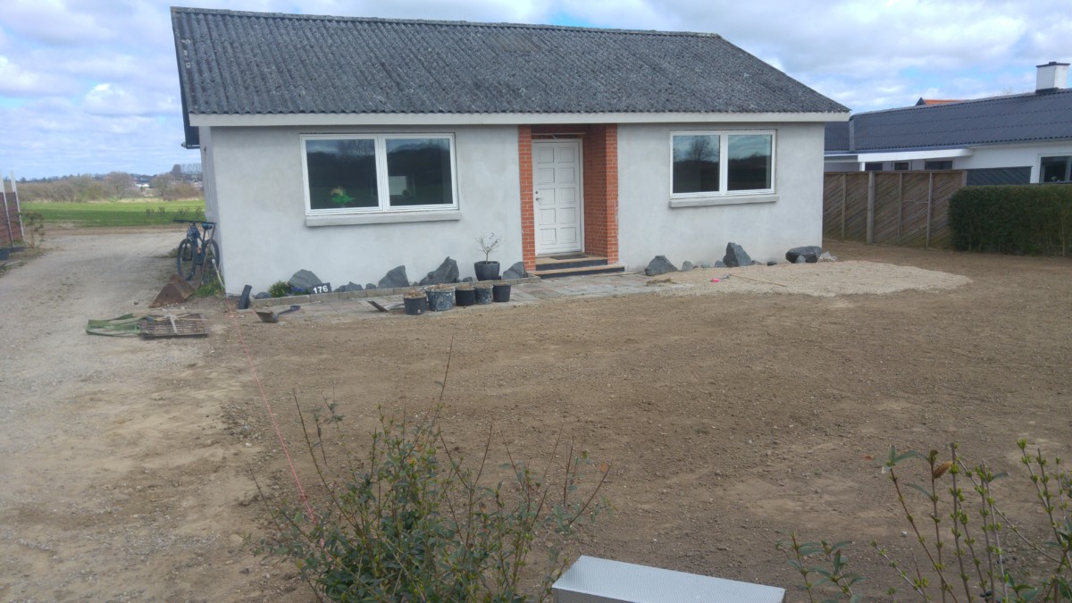 Forhaven er revet og fået lagt rullegræs, samt anlæggelse af bed foran hus er begyndt