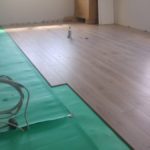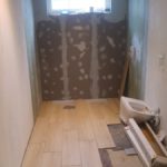 Badeværelset har fået malet første gang, og er igang med fliser på gulvet, hvor valget faldt på nogle med træ look.