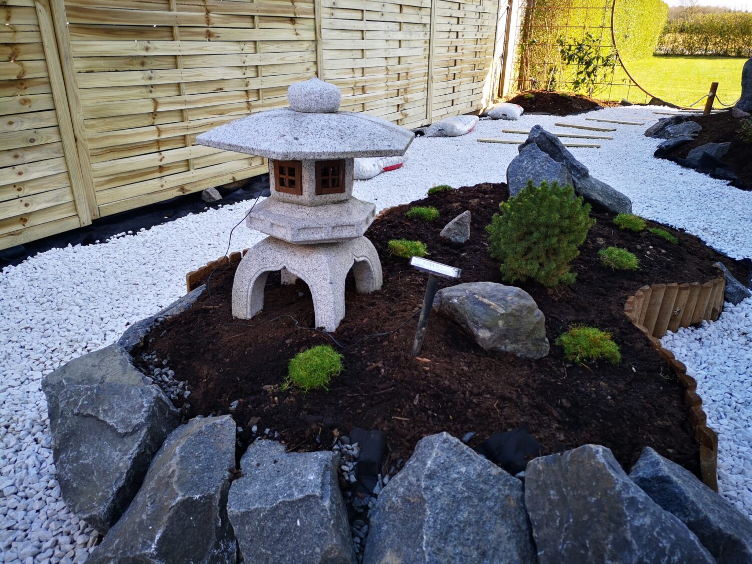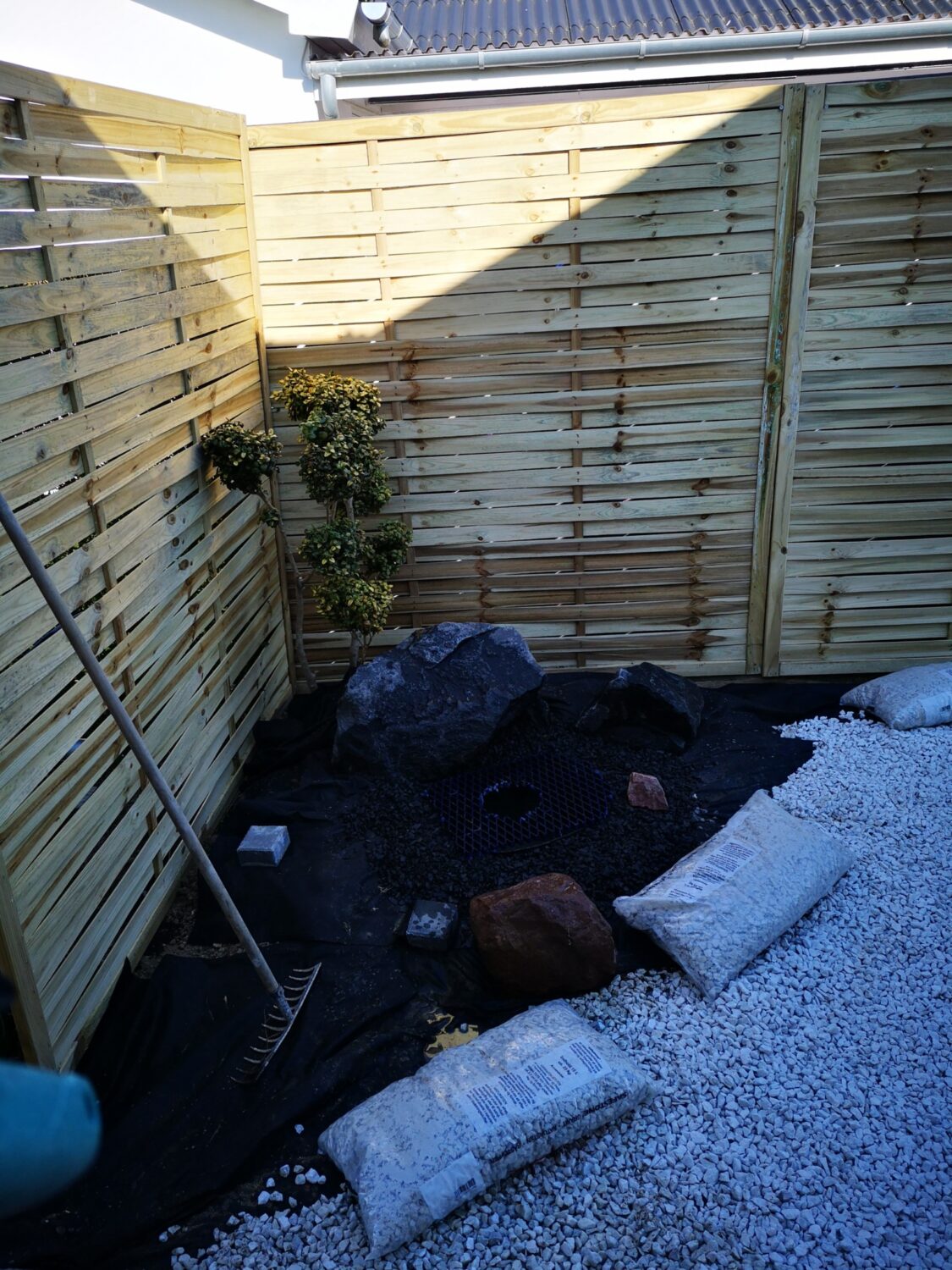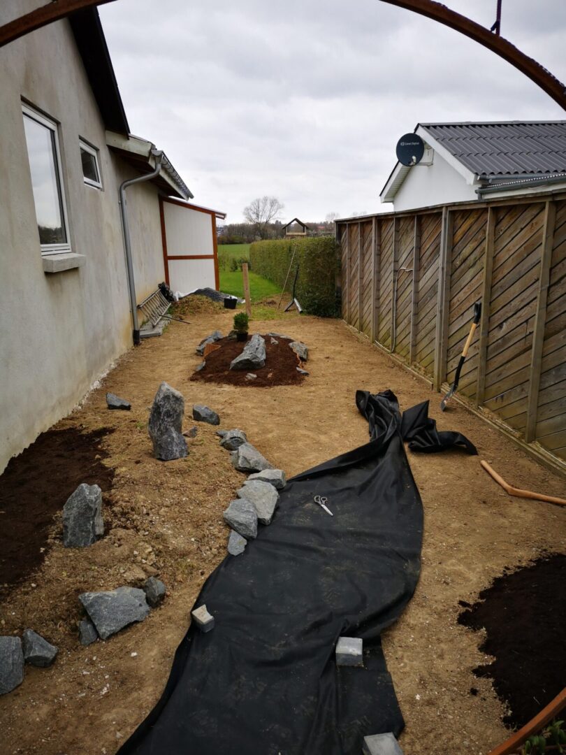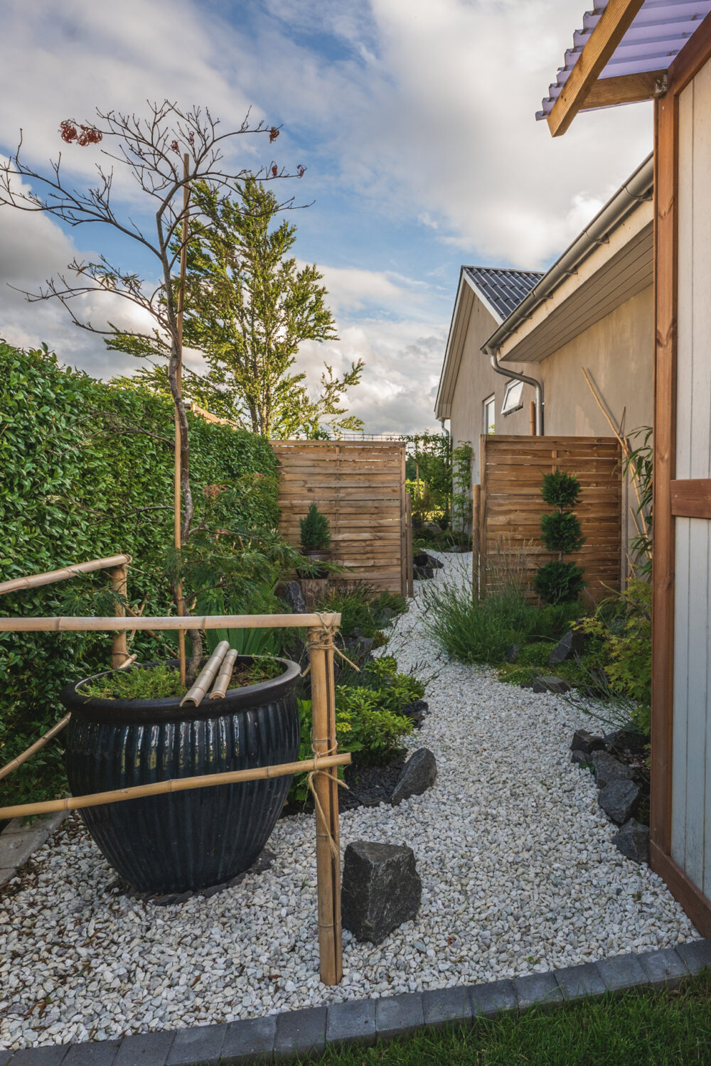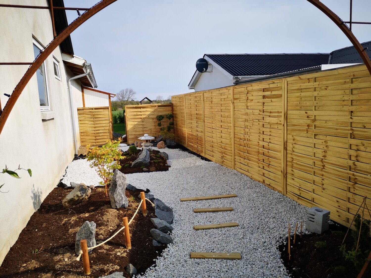 Hvad gør man med et smalt kedeligt græs stykke ind mod naboen? Anlægger mindre japansk inspireret have.