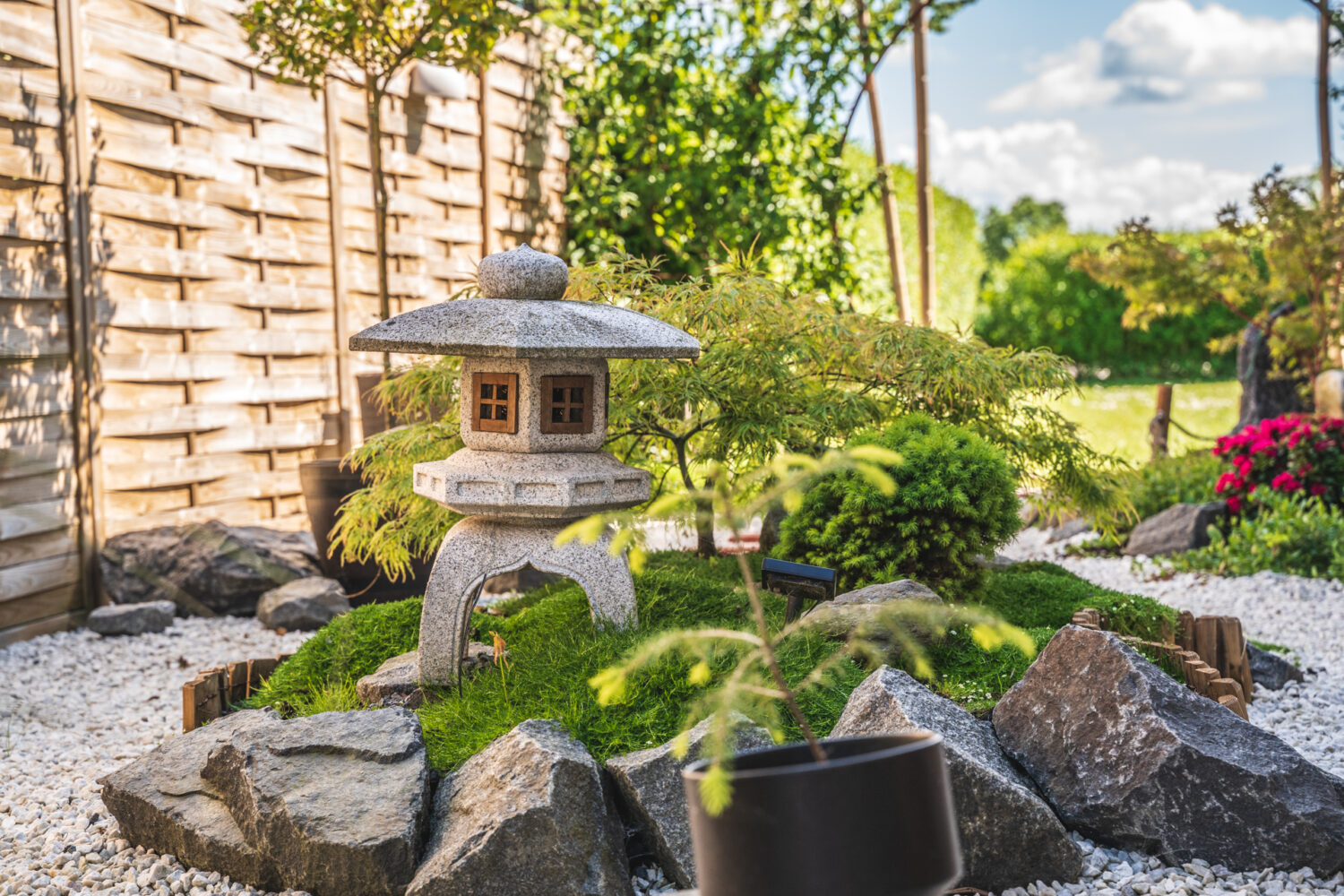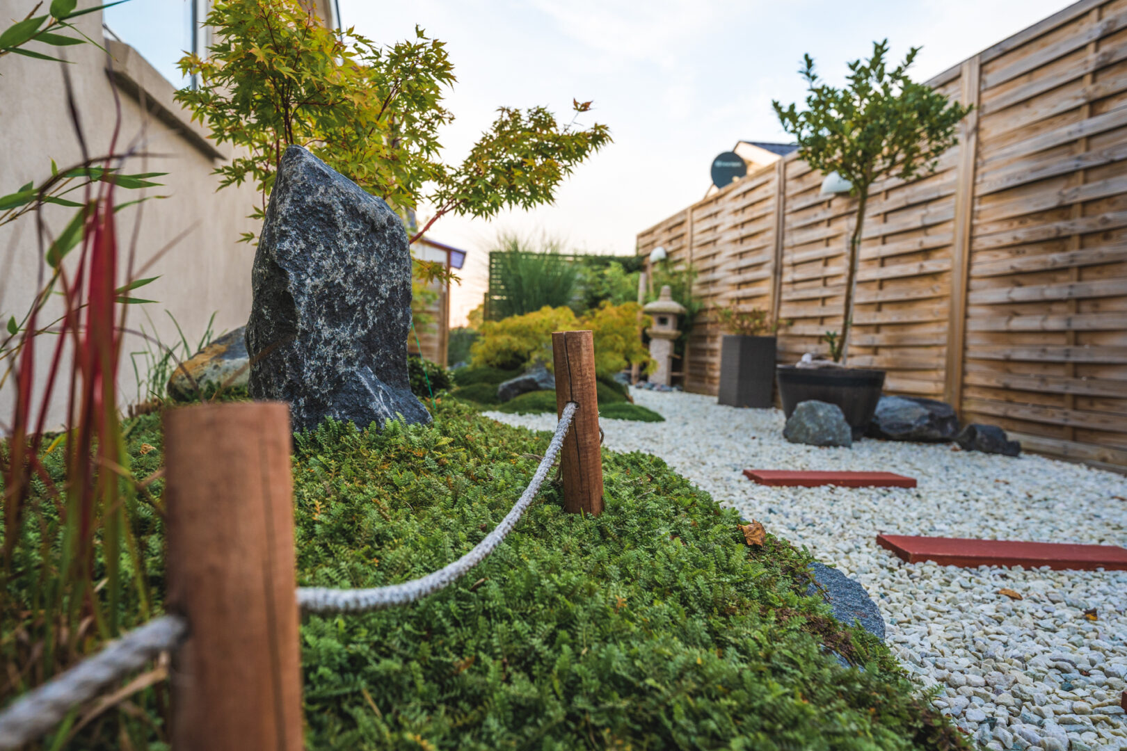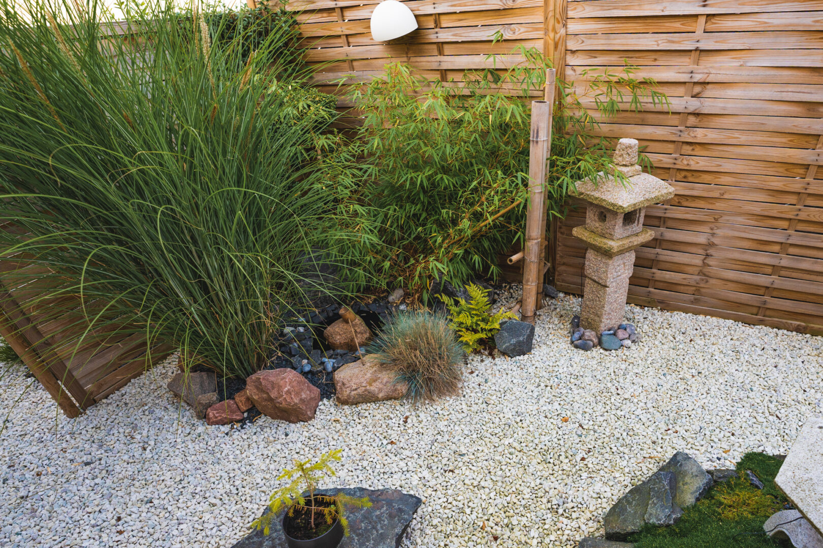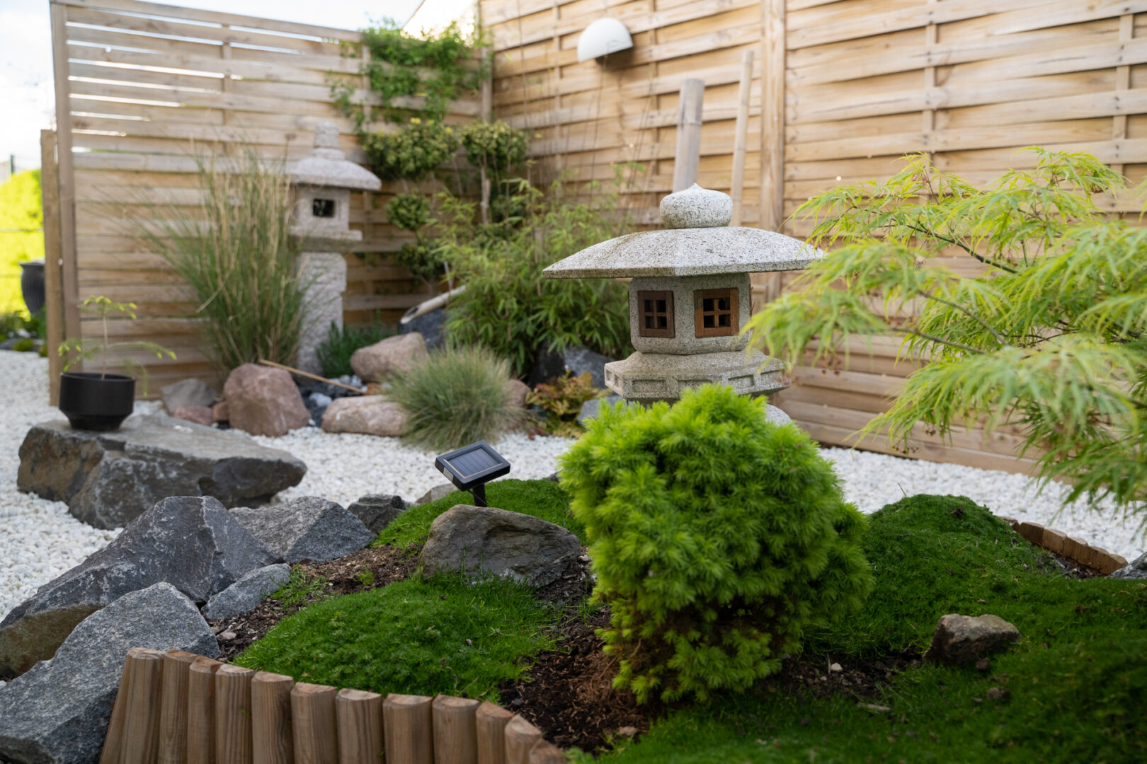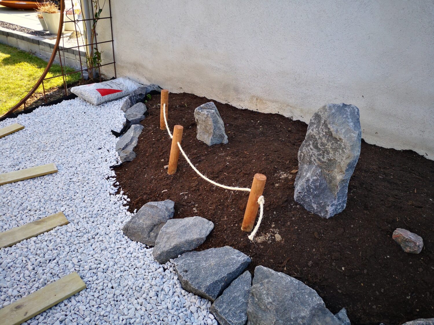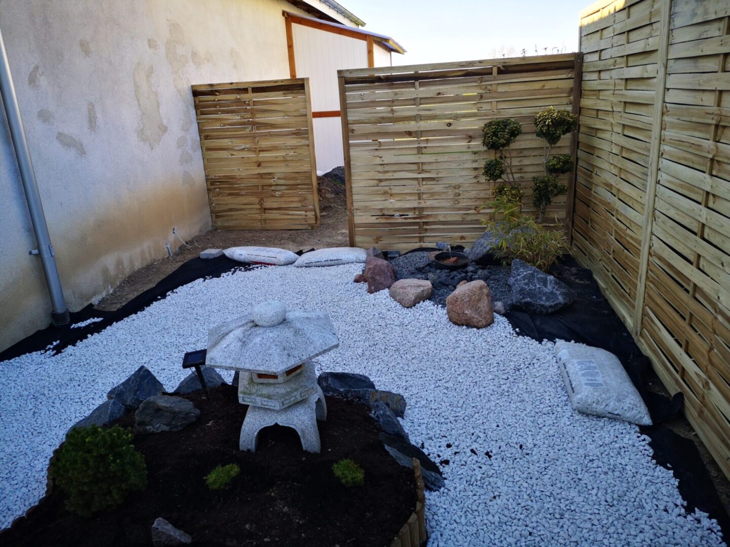 Hvad gør man med et smalt kedeligt græs stykke ind mod naboen? Anlægger mindre japansk inspireret have.