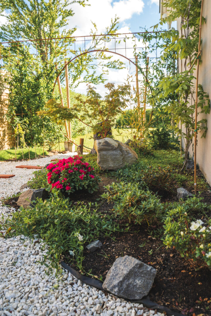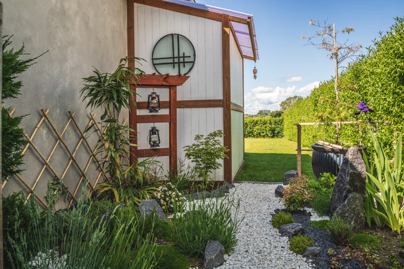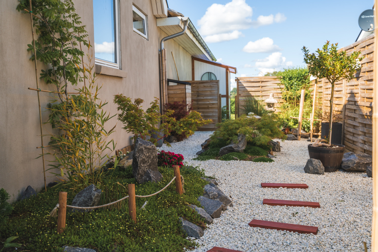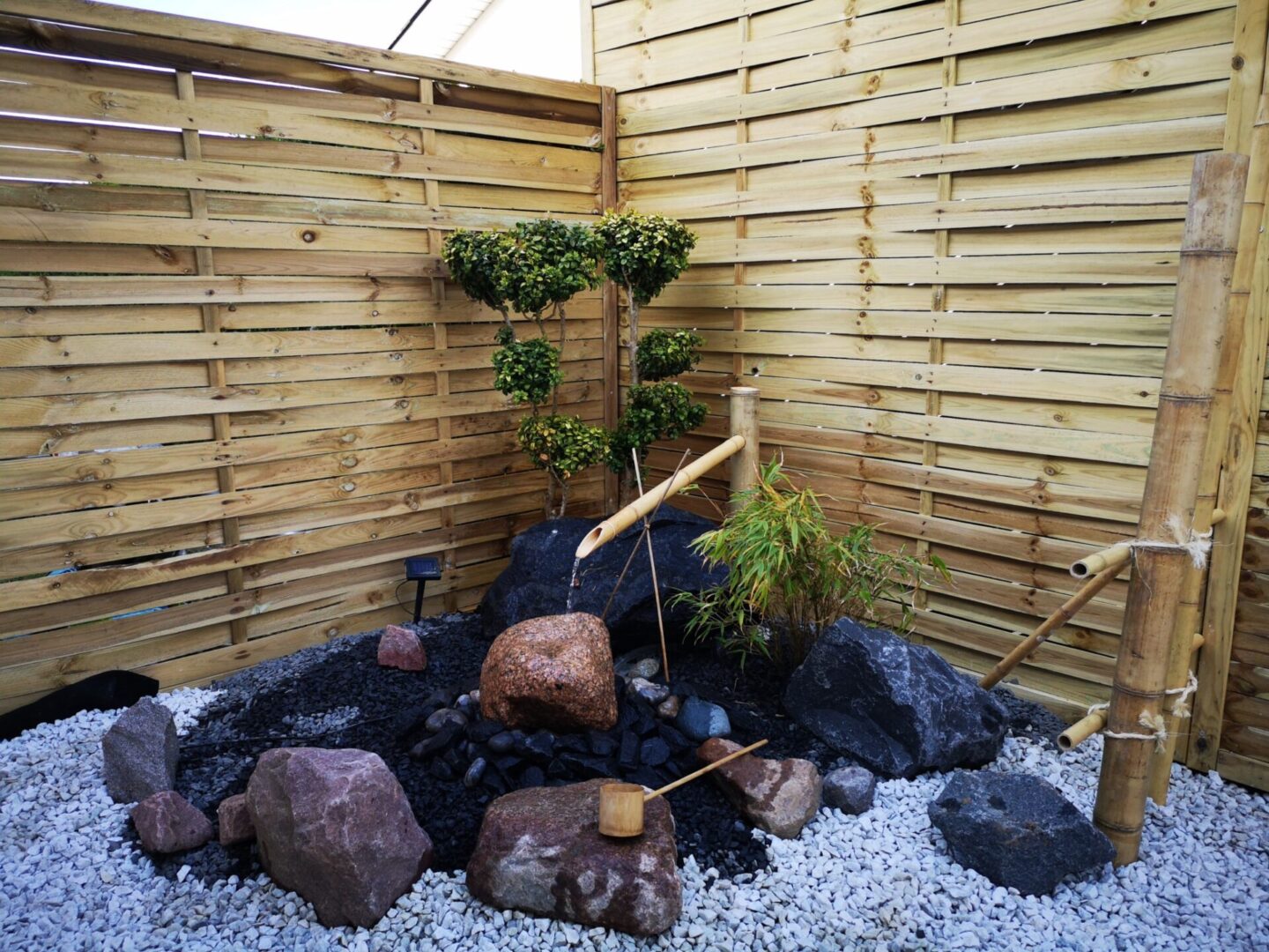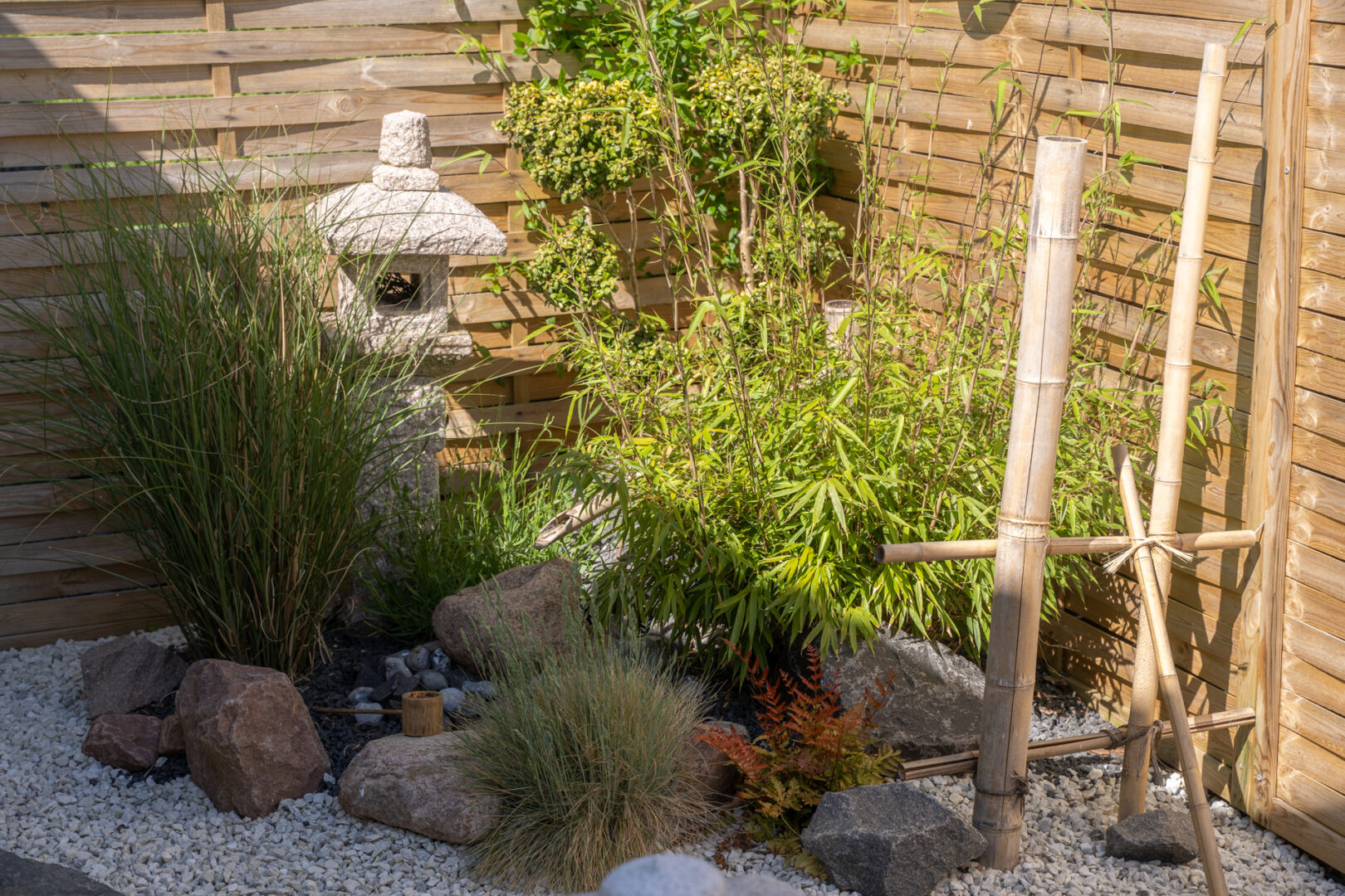 Hvad gør man med et smalt kedeligt græs stykke ind mod naboen? Anlægger mindre japansk inspireret have.