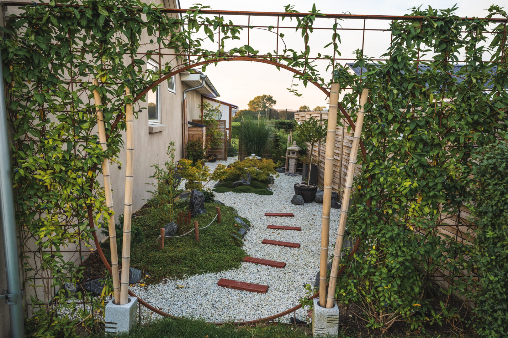 I den ene ende, hjemmesvejset måneport og slyngplanter til at gro op af gitteret rundt om.