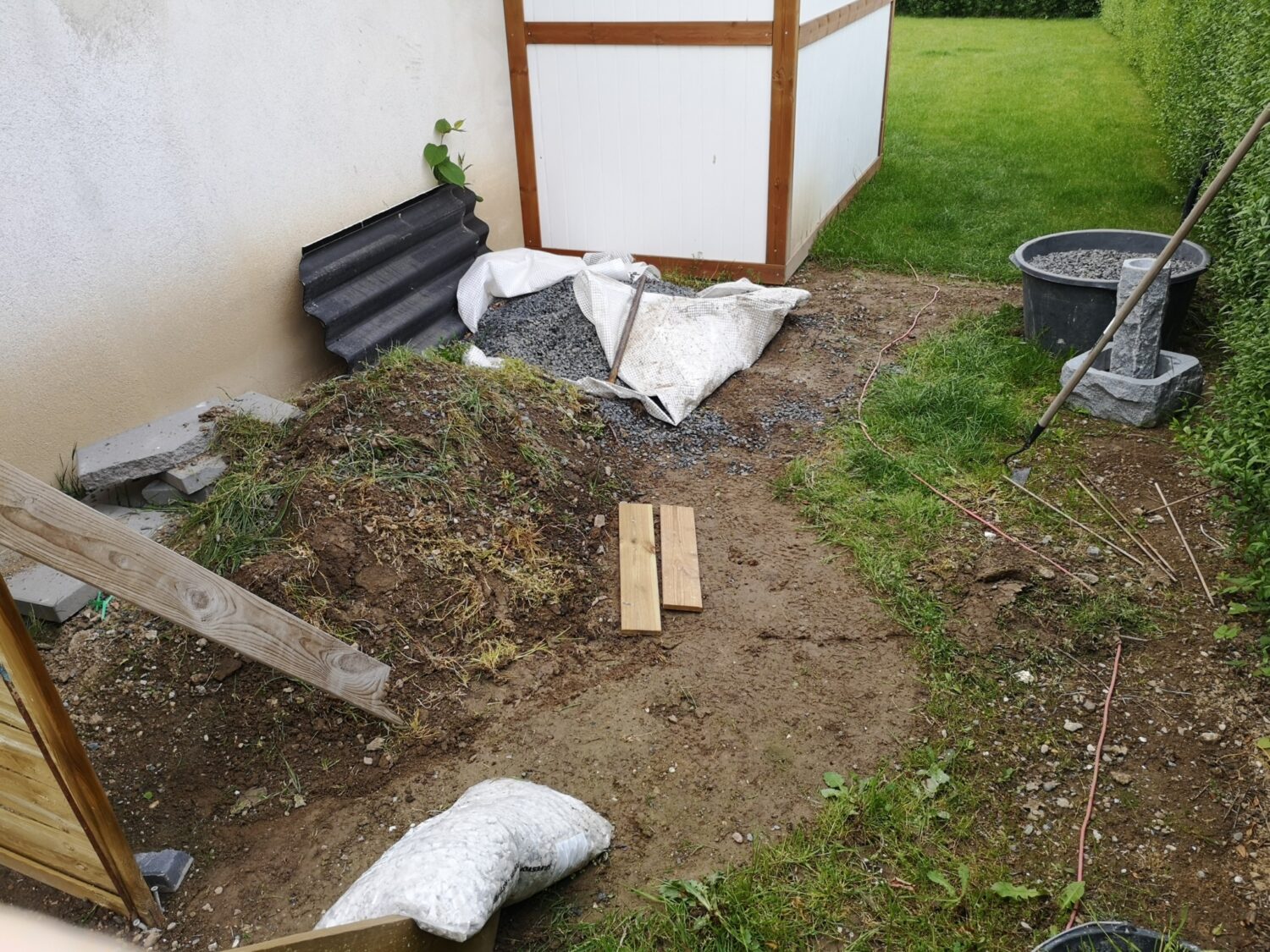 Først skulle der ryddes græs væk for herefter at kunne ligge fiberdug i bund hvor ukrudt ikke var ønsket. Det skal dog siges at det forhindrer det dog ikke i at komme, men det er for det meste frø som må lande oppe fra som til tider skal fjernes i de hvide sten.