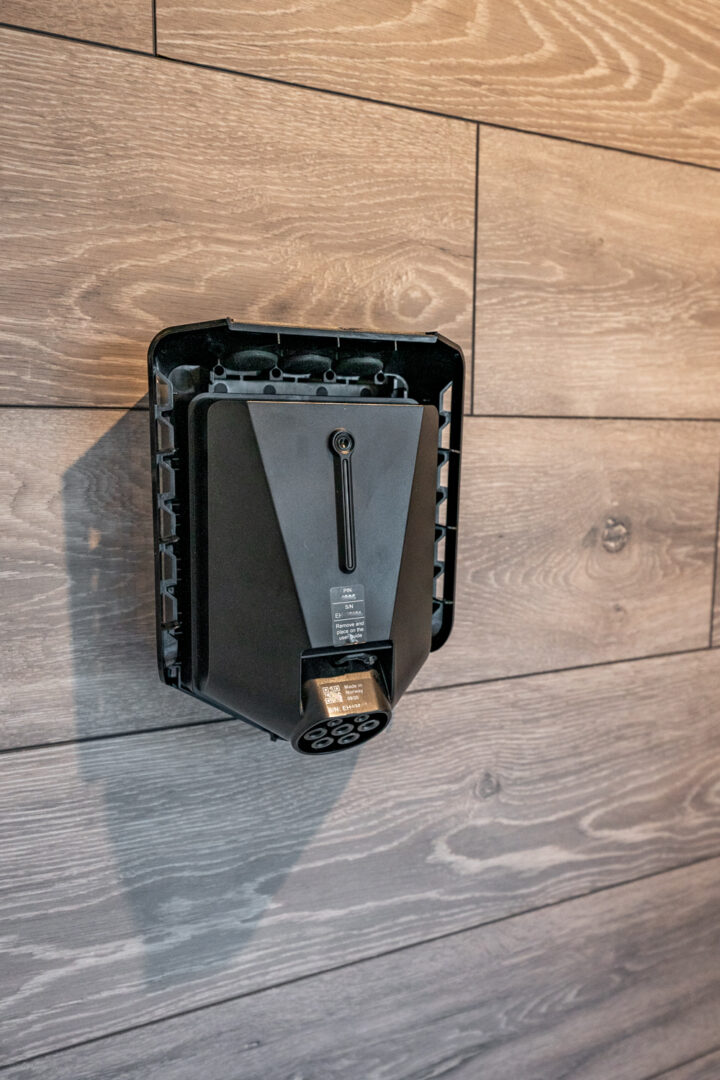 Selvom bilen i øjeblikket kun kan lade på 1 fase, med de ca. 3.7KW, så blev der trukket et 5x6mm2 installationskabel hen over loftet, så den kunne sidde på indersiden af garagen, således at man både kan nå den inde og udefra (under porten).