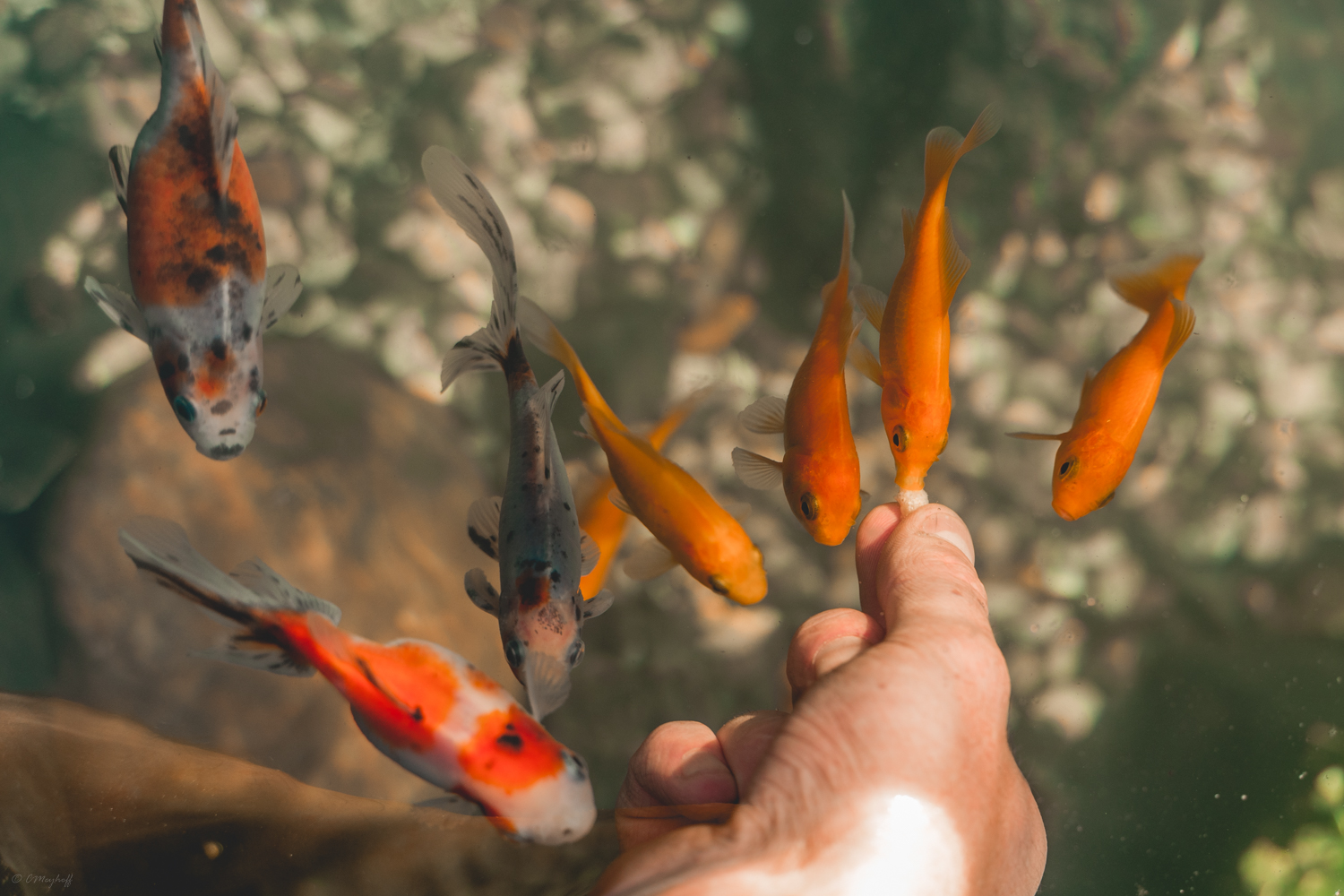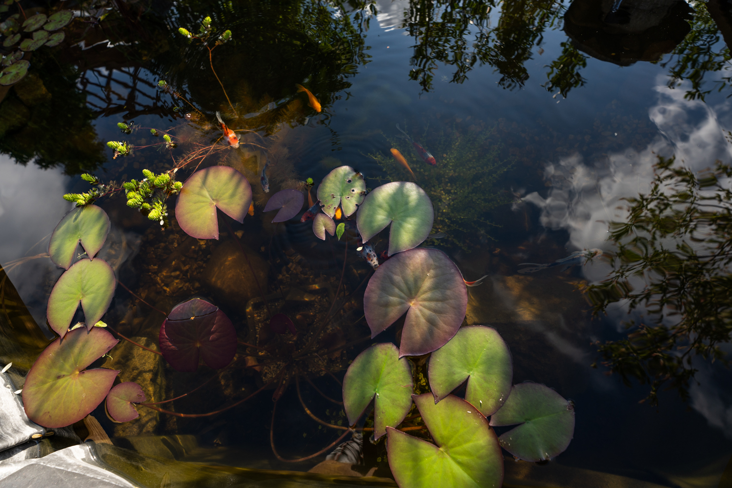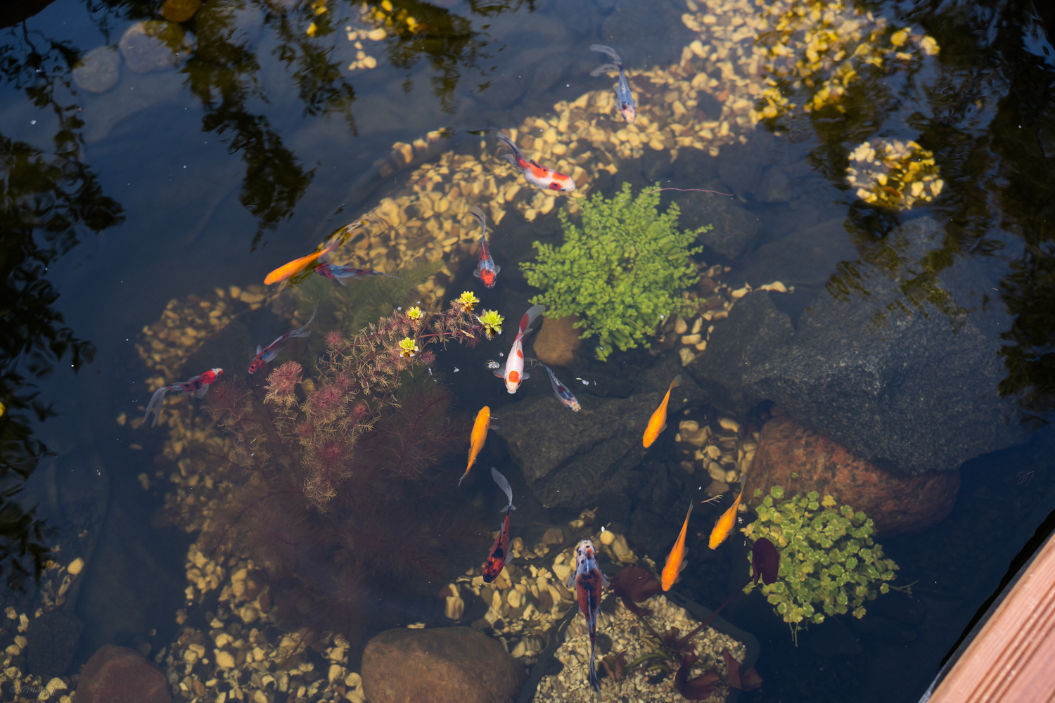 De er næsten hånd tamme og ser ud til at trives. Pumpe og filter blev et trykfiltersæt af mærket Aquaforte, hvor der ligger en pumpe på bunden, som sender vand op til filteret der står ved siden af bassinet, inden vandet bliver sendt retur.