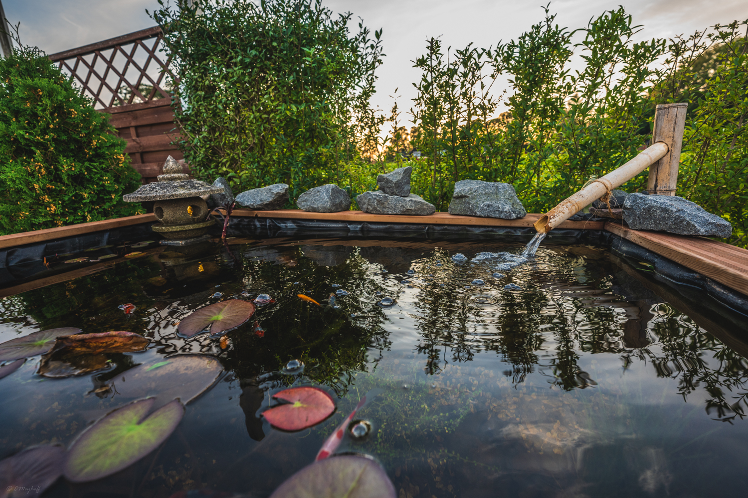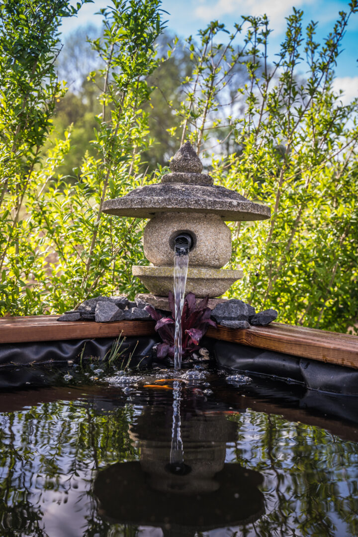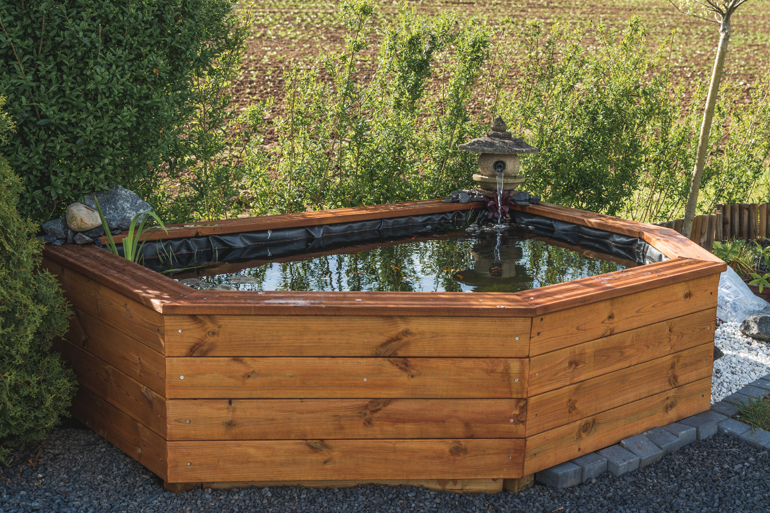 Så lidt hurtigt frem, bassin blev beklædt med træ som fik en gang olie. Fisk og planter er installeret, og af fisk blev det shubunkins, eller nogle som ligner, da Koi ikke er egnet til denne mindre størrelse bassin, men de ligner lidt derhen af. Der er dog også sneget sig en slørhale og gule guldfisk deri.