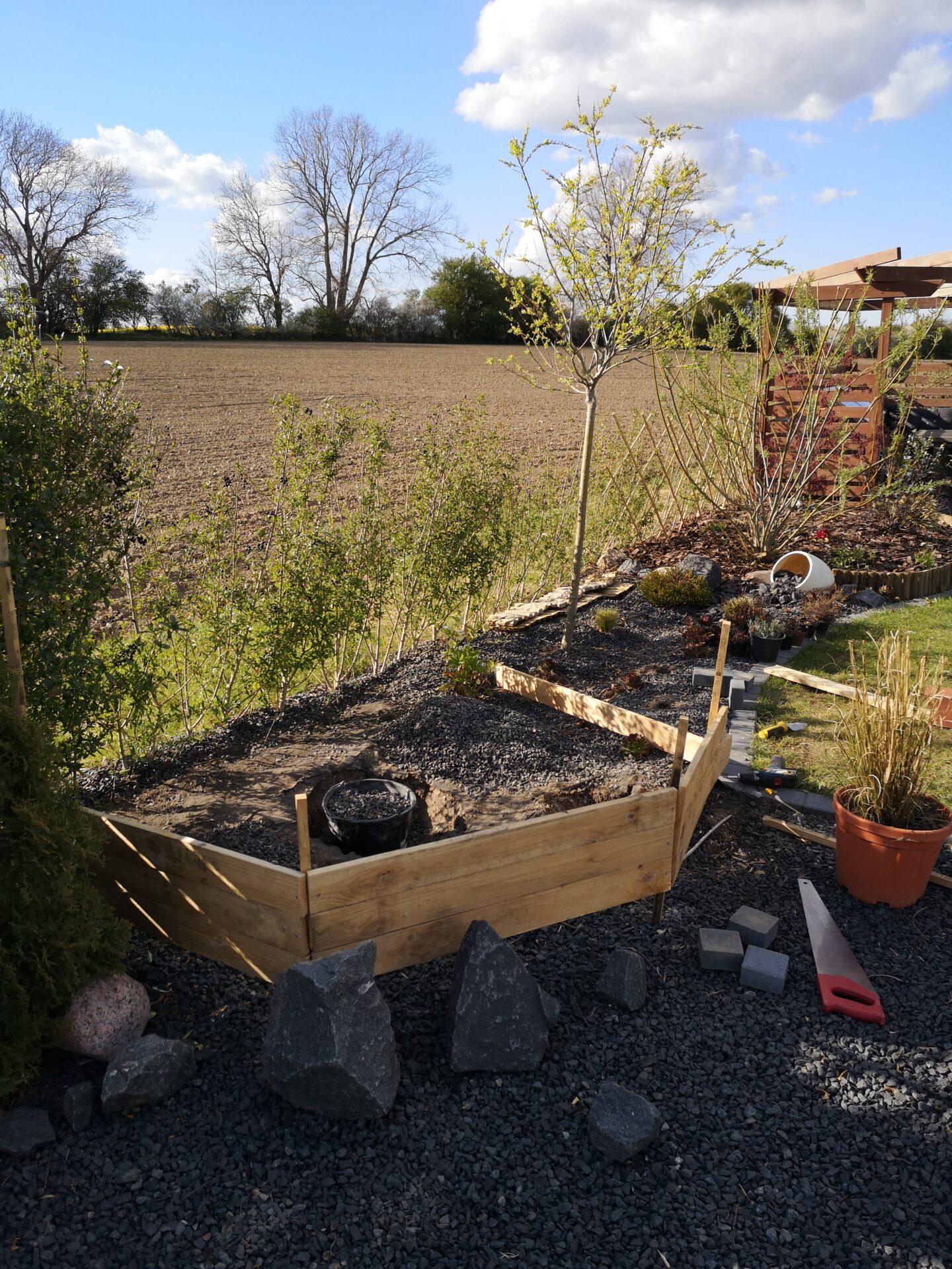 Der er lavet lidt niveauer bl.a. til planter af herregårdsten og lecablokke som fik afrundet sine skarpe kanter.