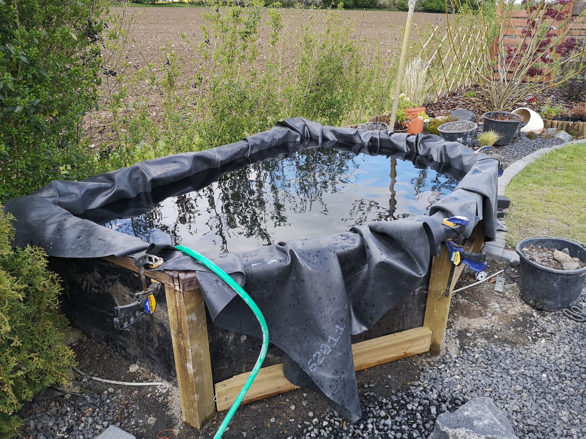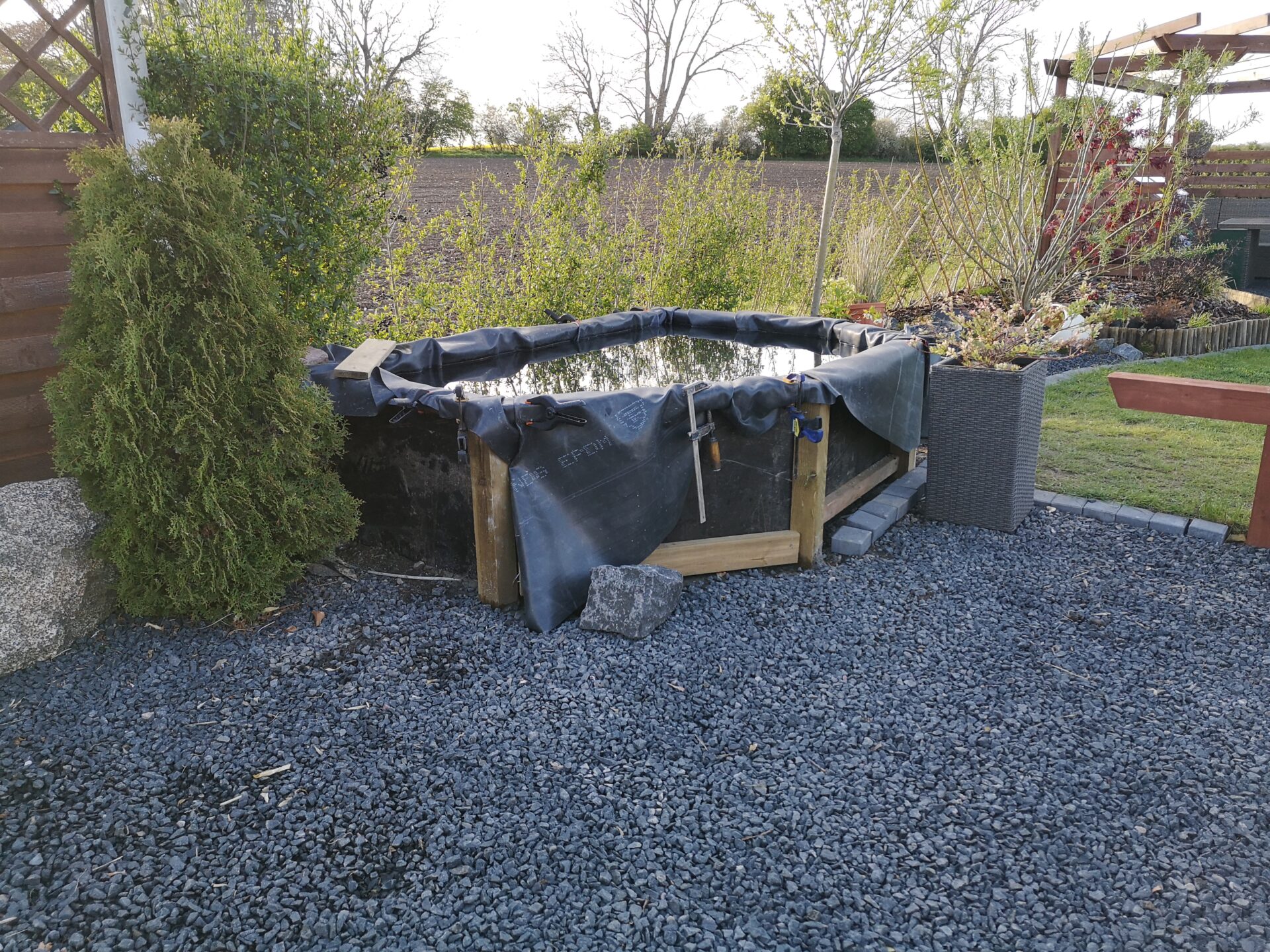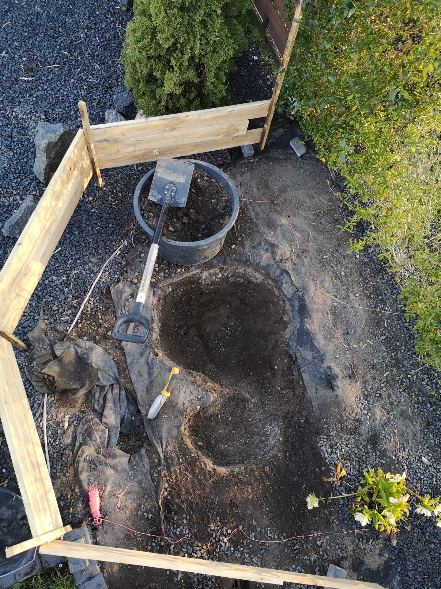Jeg havde et hjørne i indkørslen/haven, som jeg ikke var helt tilfreds med, og gik i gang med at bygge et fiskebassin i sommeren 2020.