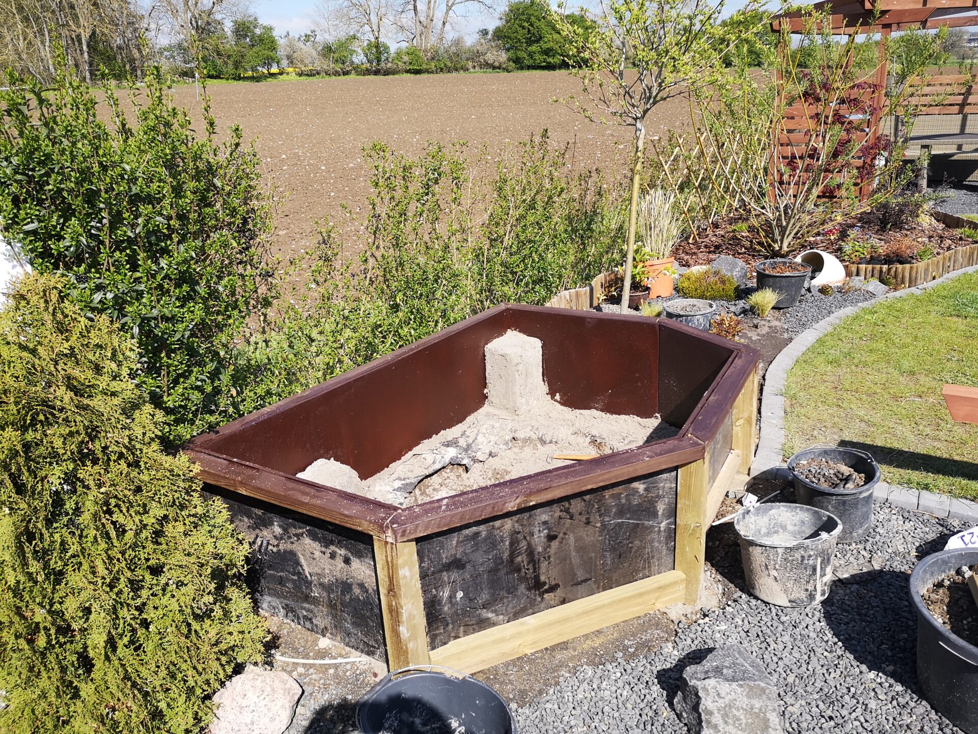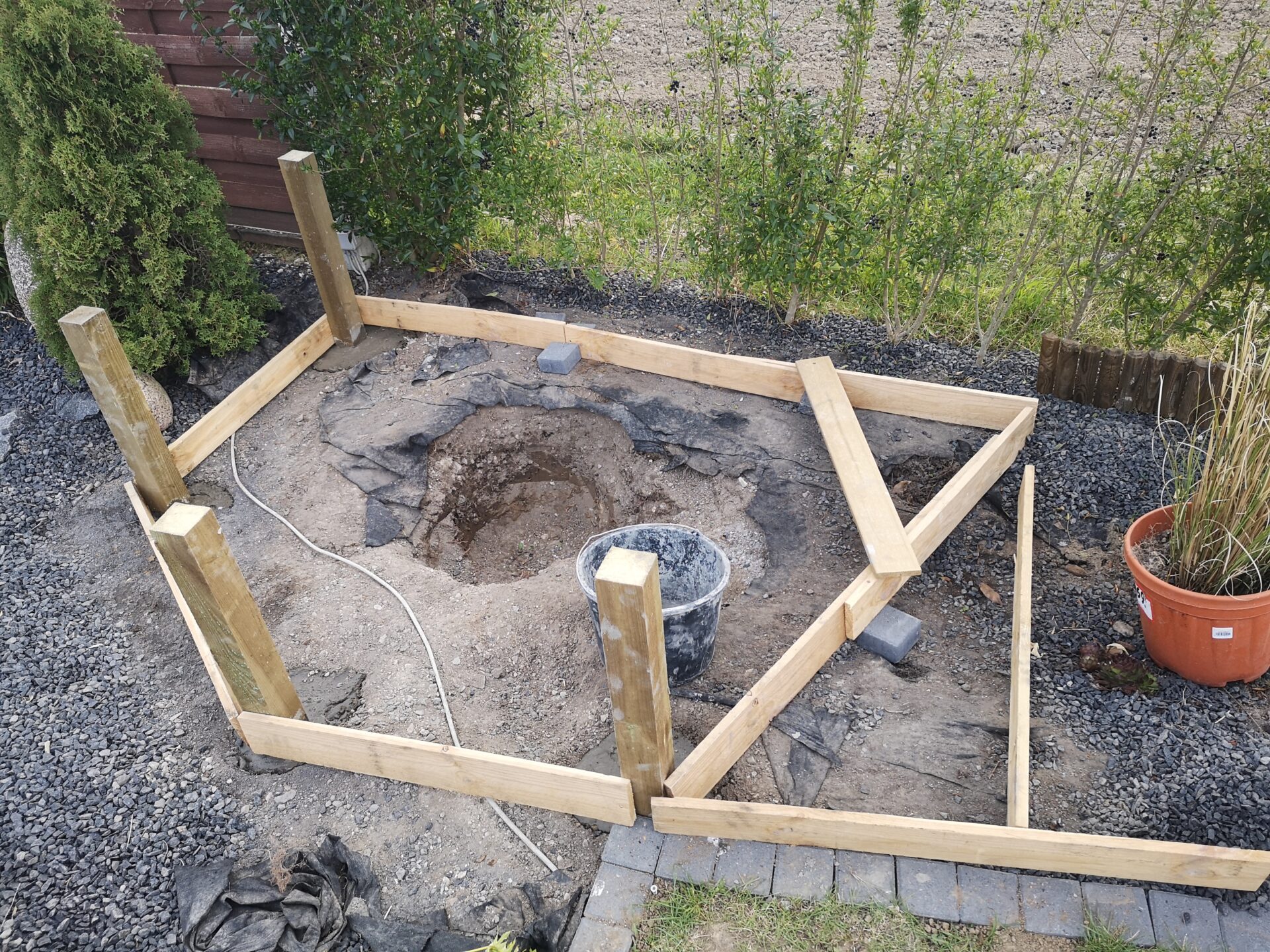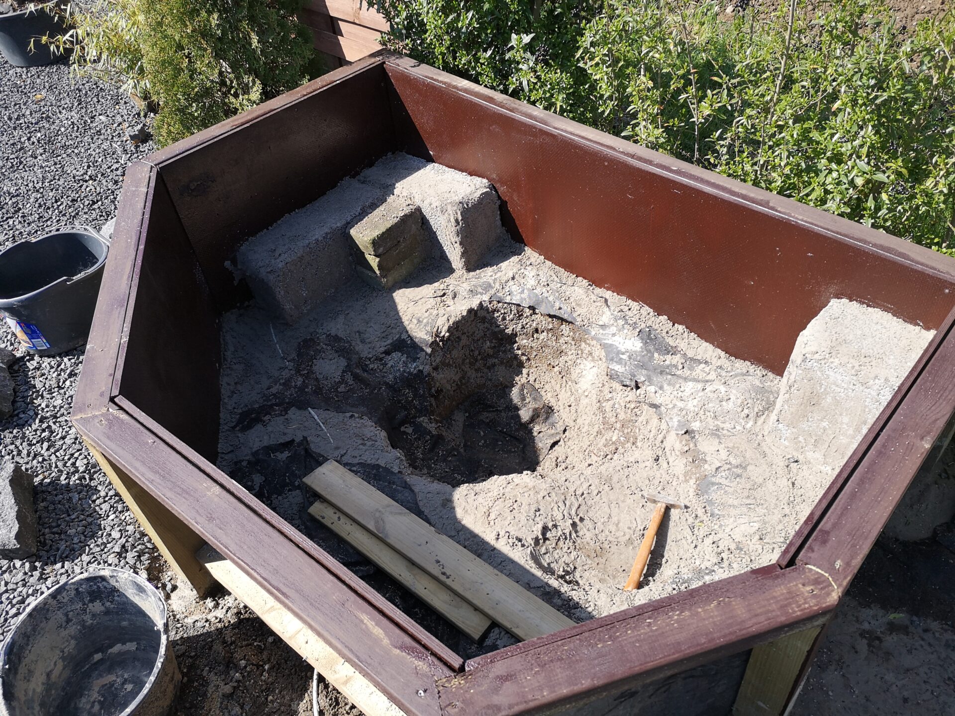 Ville helst have det lidt op i højde, og uden at skulle grave for meget. Var ude og kigge på færdig formstøbte bassiner, men der var ingen der lige passede. Støbte i stedet et par stolper ned i jorden, som efterfølgende skulle beklædes med træ.