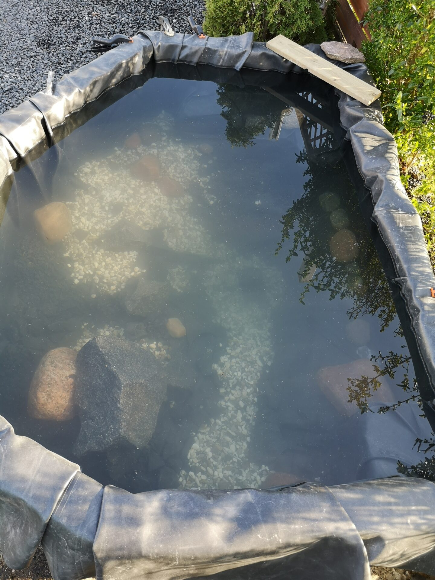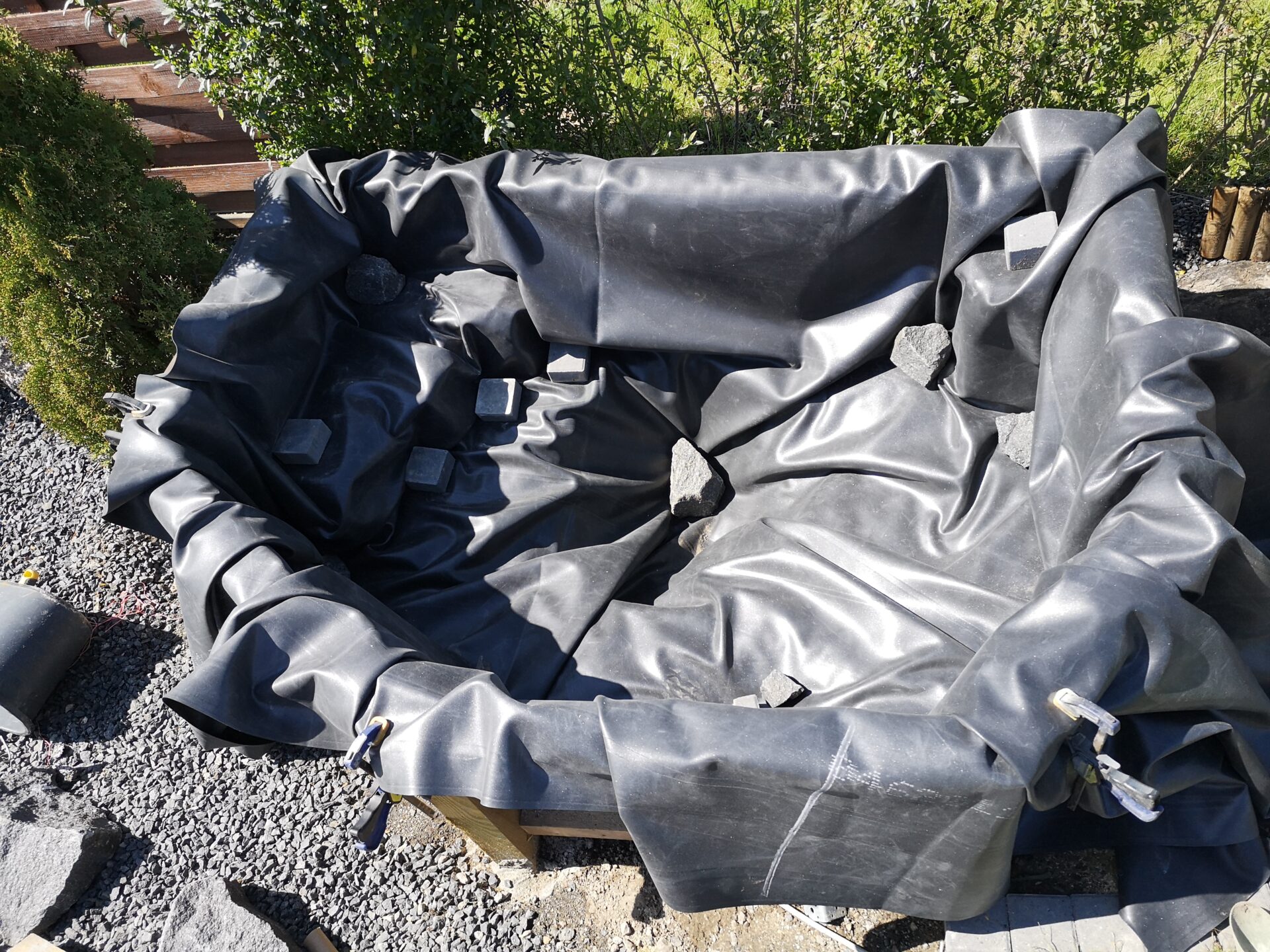 Godt 3×4 meter tyk gummifolie, blev brugt som at dække hele bassinet, og det skal siges det er ikke helt nemt at arbejde med, da det er tungt og der var mange steder hvor der blev lavet folder. Det hjælper dog så snart man hælder vand i, så kan man trække og glatte det ud så det ser pænere ud. Bunden fik dog et lag dækket til med sten så det slet ikke er til at se, kun på siderne. Den endelig bassin størrelse lå vist et sted omkring 700-800 liter.